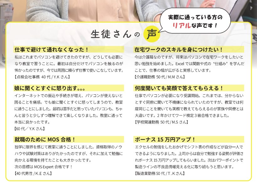 パソコン塾の良いところ:家から近い。わかりやすいです。