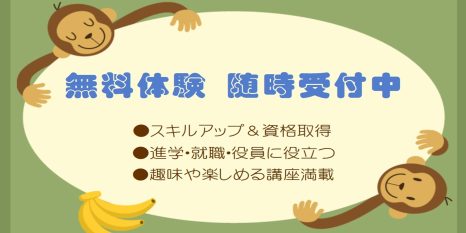 パソコン操作のスキルアップ 資格取得 就職や転職 地域の役員で役立つ内容 趣味として楽しめる講座を準備しております。ご家族やご友人と一緒に無料体験へいらっしゃいませんか\(^o^)/