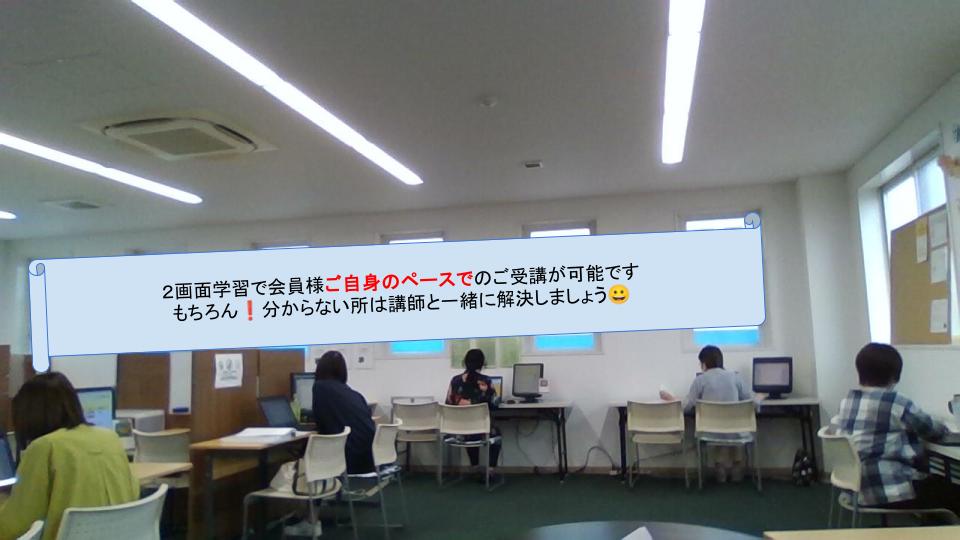 お手本画面の映像を見て、説明を聞きながらパソコンを操作する2画面学習方式。一人ひとりのペースで学べて、わからなかったところは巻き戻して何度でもやり直せるから、確実にレベルアップできます。
