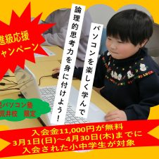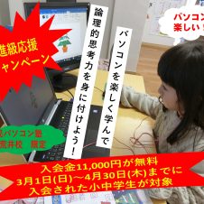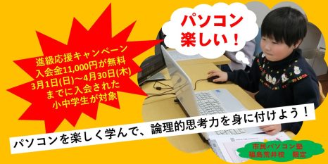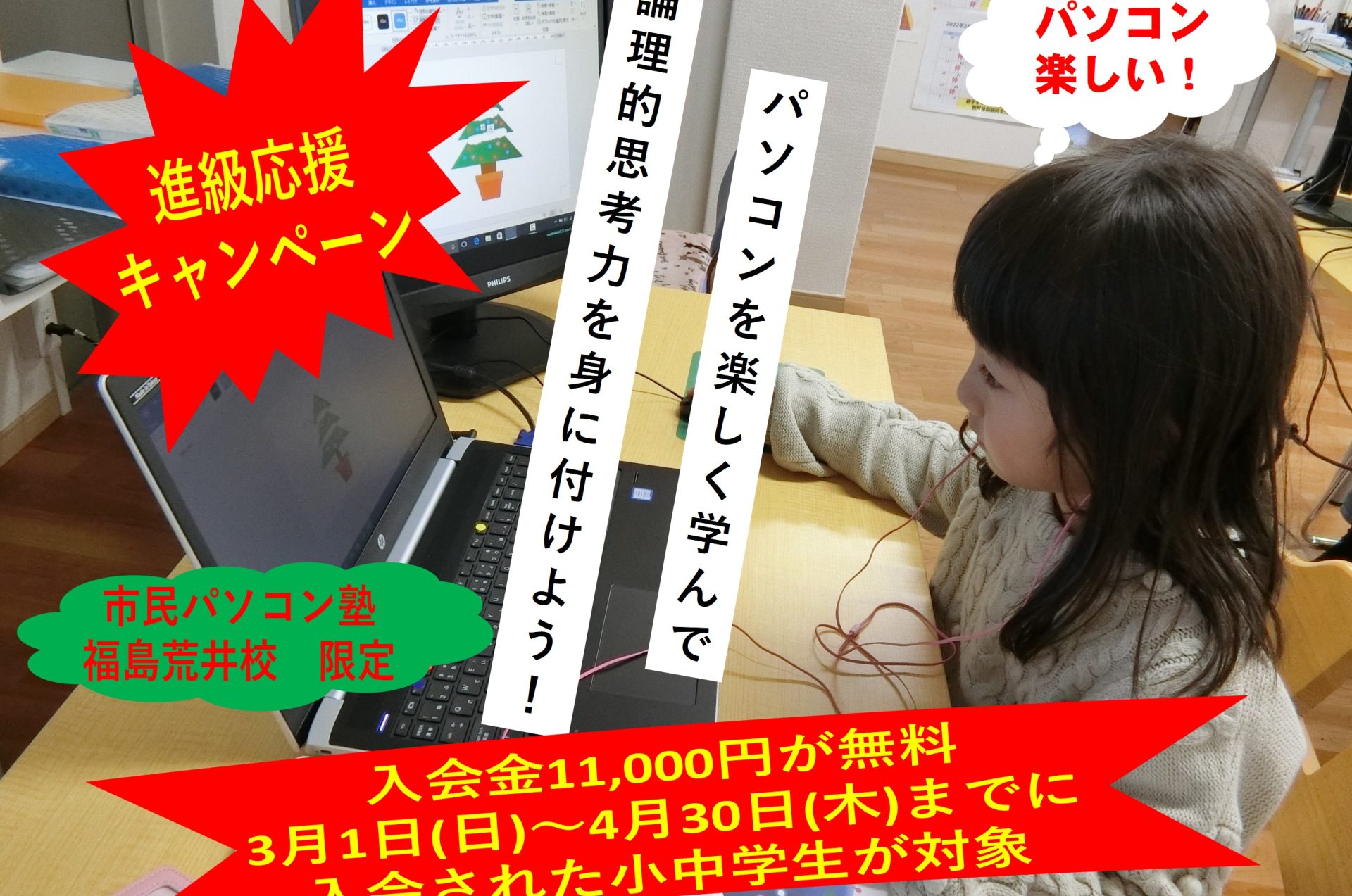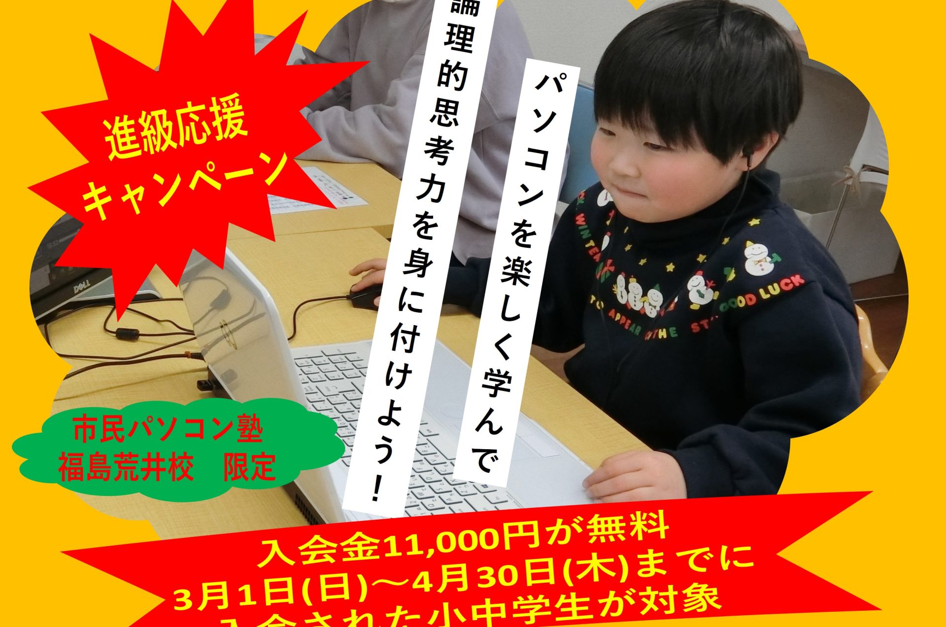 進級応援キャンペーン 入会金11,000円が無料 3月1日(日)~4月30日(木)までに入会された小中学生が対象 (市民パソコン塾 福島荒井校 限定)