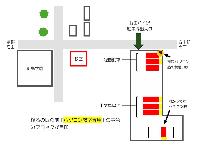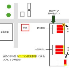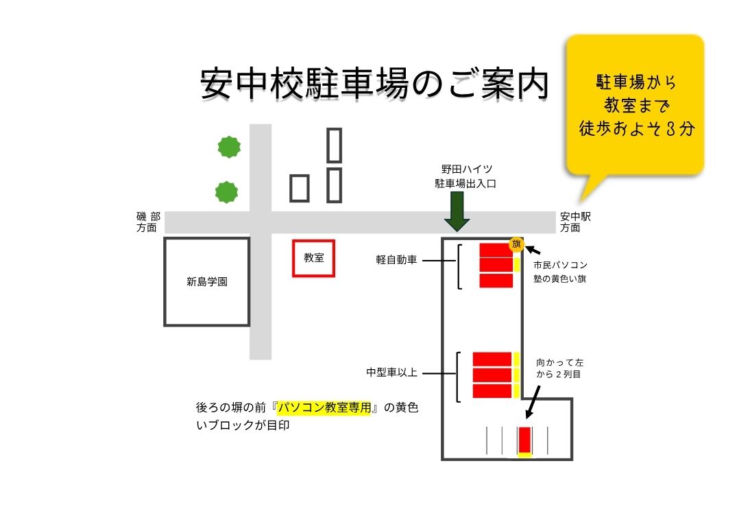 後ろの壁際に「パソコン教室専用」の黄色いブロックあり
