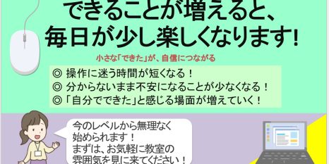 「苦手だから…」と後回しにしていたパソコンも、 小さな「できた」を積み重ねることで、自信につながります 今のレベルから、ゆっくり始めてみませんか! お気軽にご相談ください(^^)/