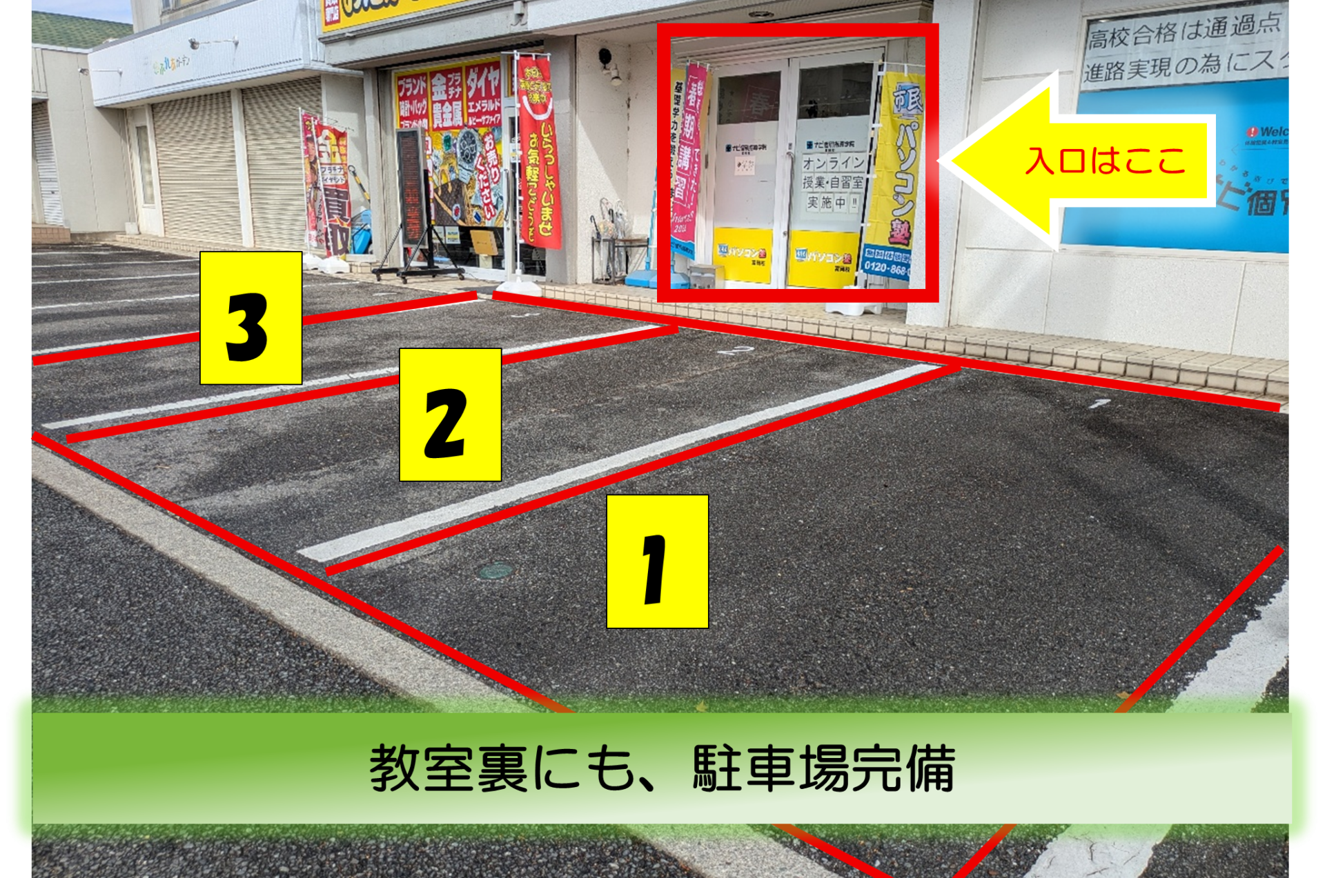 富岡校では駐車スペースを2箇所ご用意しています。
