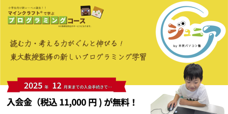 マインクラフトで楽しみながらプログラミングを学習できます! 12月末まで入会金無料です! プログラミング的思考力・学習言語力(CALP)・要約力が身につきます。 ぜひ無料体験にお申し込みくださいね!