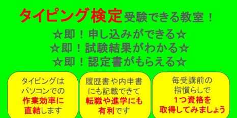 パソコンを活用するのに文字入力がスムーズにおこなえるのはとっても有利ですね!市民パソコン塾では履歴書にも記載できる「e-typing master」の受験ができる教室です!転職や進学にも有効な資格です。市民パソコン塾はご入会いただき、希望があれば①即日申し込み②即日受験③即日結果がわかる!教室です!是非お問い合わせをお待ちしております☆彡