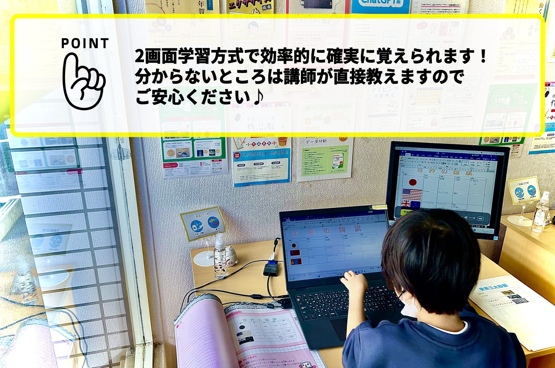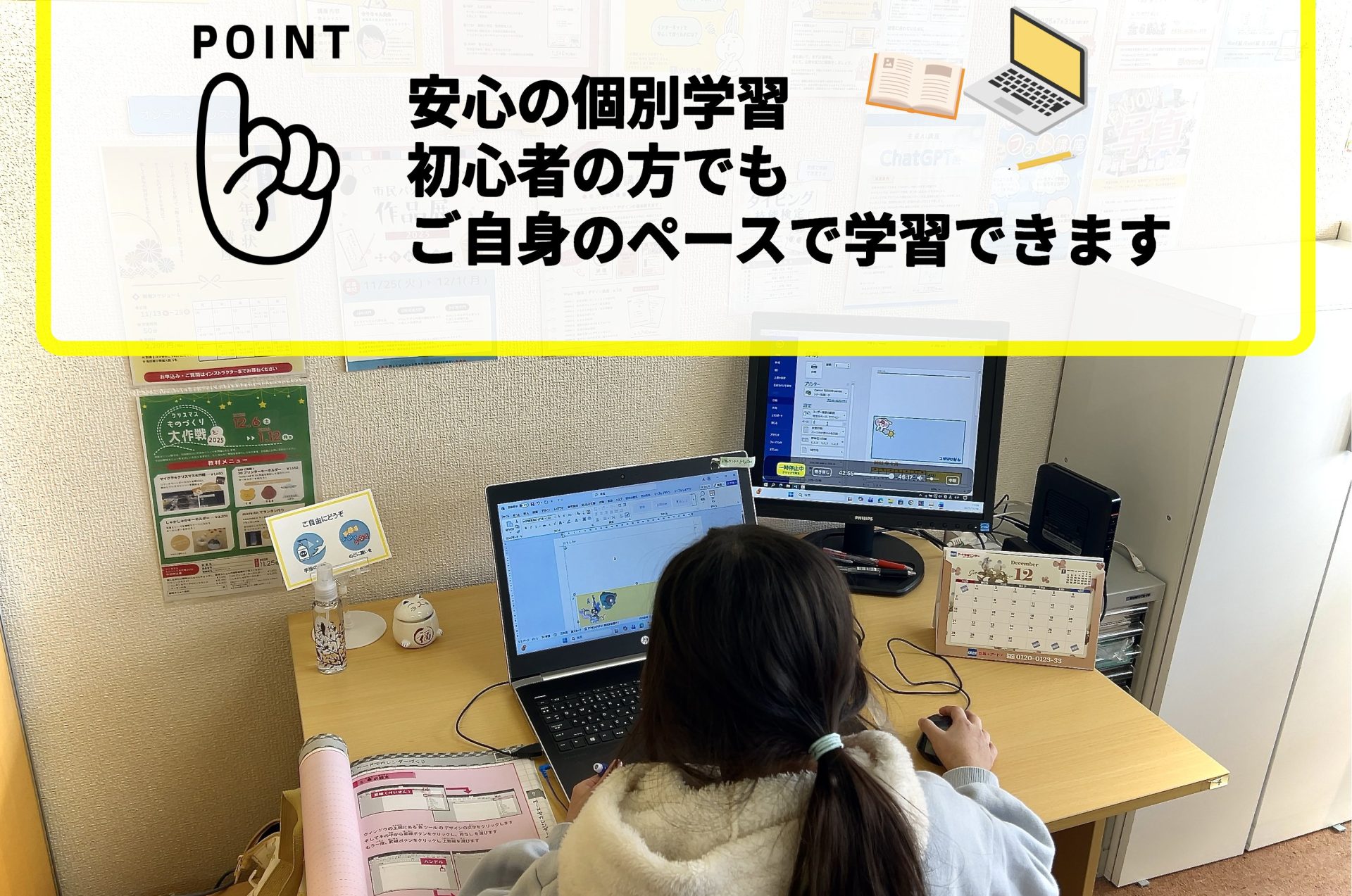 パソコン操作が苦手な方でも楽しく学びながらステップアップできるよう優しく丁寧に対応いたしますのでご安心ください♬