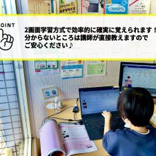 お手本画面の映像を見て、説明を聞きながらパソコンを操作する2画面学習方式。一人ひとりのペースで学べて、わからなかったところは巻き戻して何度でもやり直せるから、確実にレベルアップできます。