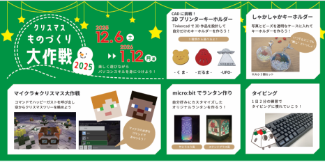 毎年大好評の冬のイベントが今年もいよいよ始まります! 申込締切は11月25日(火) 大人気の「マイクラ」をもちろん 「3Dプリンターキーホルダー」や 「micro:bit」を使ってランタン作り お気に入りの写真を使って「しゃかしゃかキーホルダー」が作成できます お子様だけでなく大人の方でも楽しんで頂けます!! 皆様のご参加お待ちしております